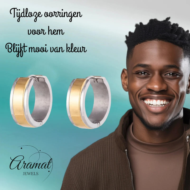 De brede (7mm) oorringen hebben een glanzende afwerking en zijn voorzien van een brede goudkleurige streep in het midden, die scherp contrasteert met de zilverkleurige RVS basis aan de zijkanten. Met een buitenmaat van 20mm zijn deze Creolen een perfecte Huggie-maat die comfortabel sluit. Het handige scharniersysteem maakt ze gemakkelijk in te doen en het stoere formaat is ideaal voor zowel uniseks volwassenen als kinderen.