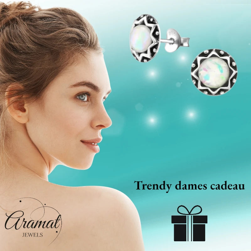 In het midden schittert een fascinerende witte opaal met een diameter van 9mm. Opaal staat bekend om zijn unieke irisering – een regenboog van kleuren die verandert met de lichtinval. Dit zorgt voor een magische, veelzijdige look die perfect past bij de trend van boho en spirituele sieraden. De ronde studs hebben een klassieke, volle vorm, wat ze een luxe uitstraling geeft.