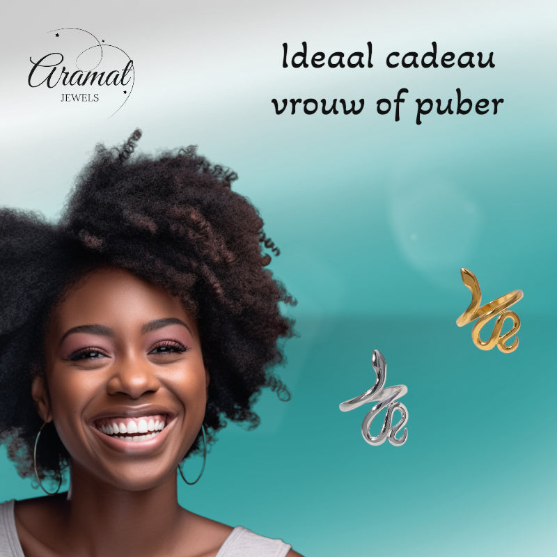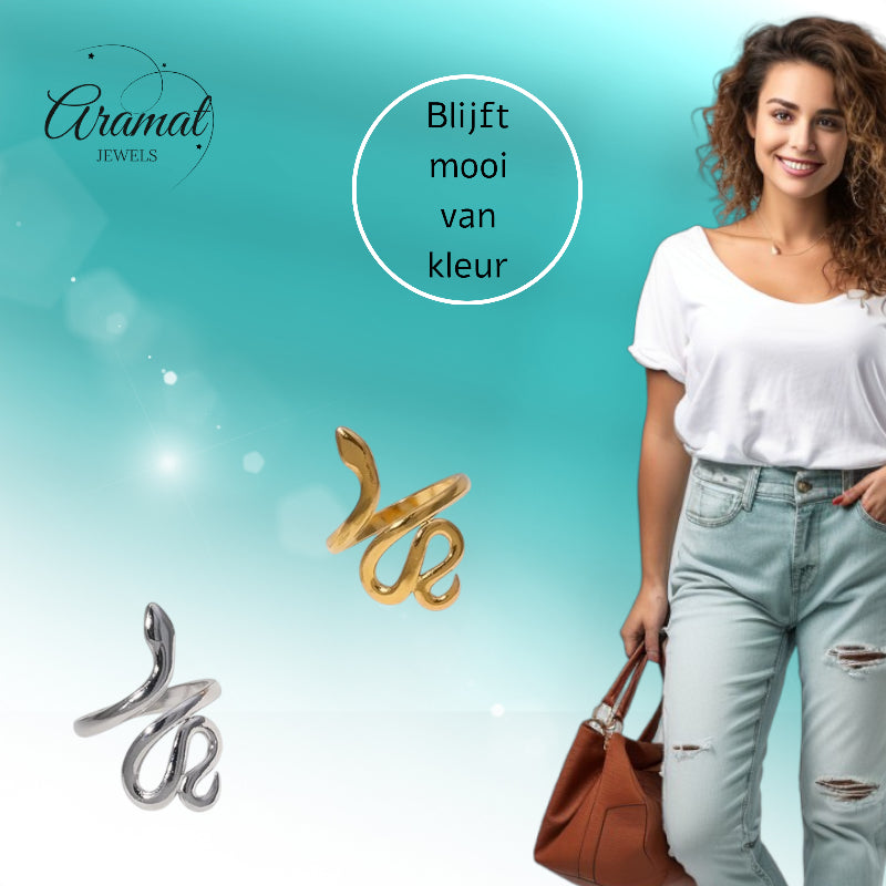 Bent u klaar om de show te stelen? Deze opvallende statement ring van Aramat Jewels® is een echte blikvanger voor elke sieradenliefhebber. Met een indrukwekkende breedte van 28 mm en een gedetailleerd slangenontwerp geeft deze ring uw hand direct een stoere en luxe uitstraling. Het tijdloze cobra-design slingert zich elegant om uw vinger, wat zorgt voor een unieke festivallook.