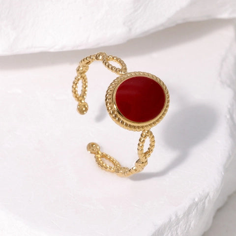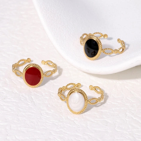 Deze modieuze open ring is een feest voor het oog. Het sieraad combineert een speelse, organische vorm met een centraal ovaal element gevuld met levendig emaille. Het emaille is verkrijgbaar in de kleuren wit, zwart of rood en wordt omrand door een subtiel dot reliëf.