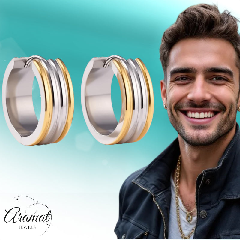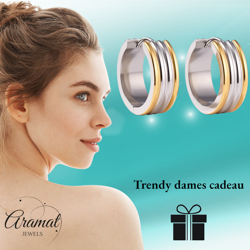 De Bicolor Stalen Oorringen met Drie Strepen van Aramat Jewels® zijn een perfecte balans tussen elegantie en modern design. Ze zijn gemaakt van duurzaam en sterk RVS, geschikt voor elke gelegenheid.