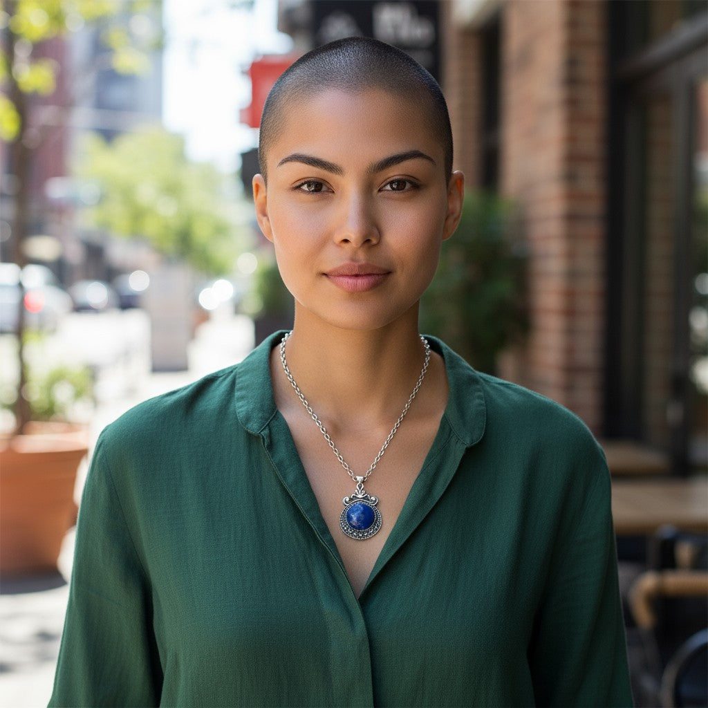 De halsketting is vervaardigd uit hoogwaardige zinklegering en is voorzien van een prachtige donkerblauwe synthetische steen met een marmerachtig patroon. De bewerkte hanger geeft de ketting een elegante en bohemien uitstraling die perfect past bij diverse stijlen en outfits.