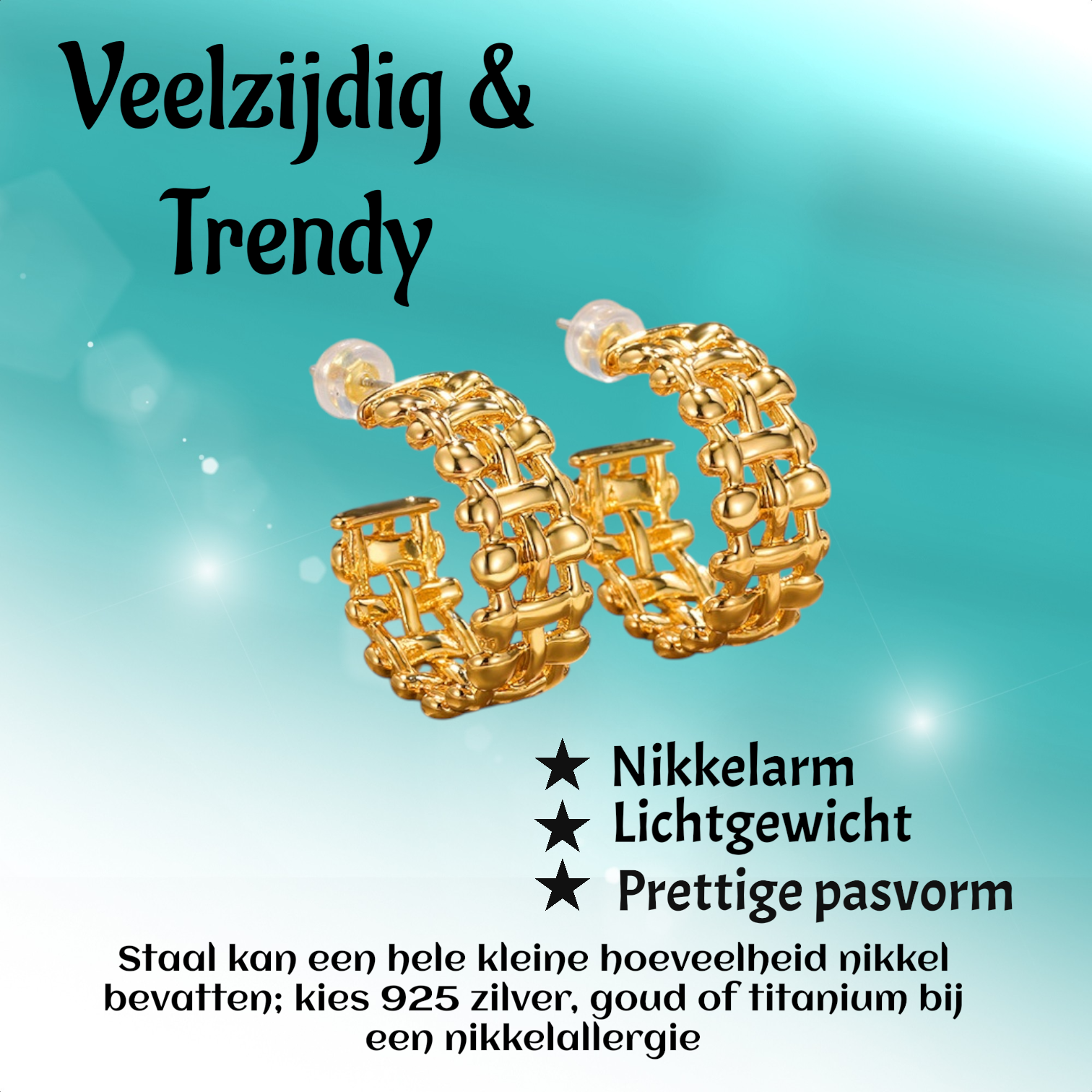 Deze oorbellen zijn vervaardigd van hoogwaardig 304 roestvrij staal (RVS) met een duurzame goudkleurige afwerking. Dit RVS sieraad is volledig waterproof en zal bij normaal gebruik niet verkleuren. Of je nu doucht, sport of een avondje uit gaat, de warme goudkleurige glans blijft behouden. Het is de beste keuze voor een dagelijkse stijl voor wie op zoek is naar een onderhoudsvrij en tijdloos cadeau.