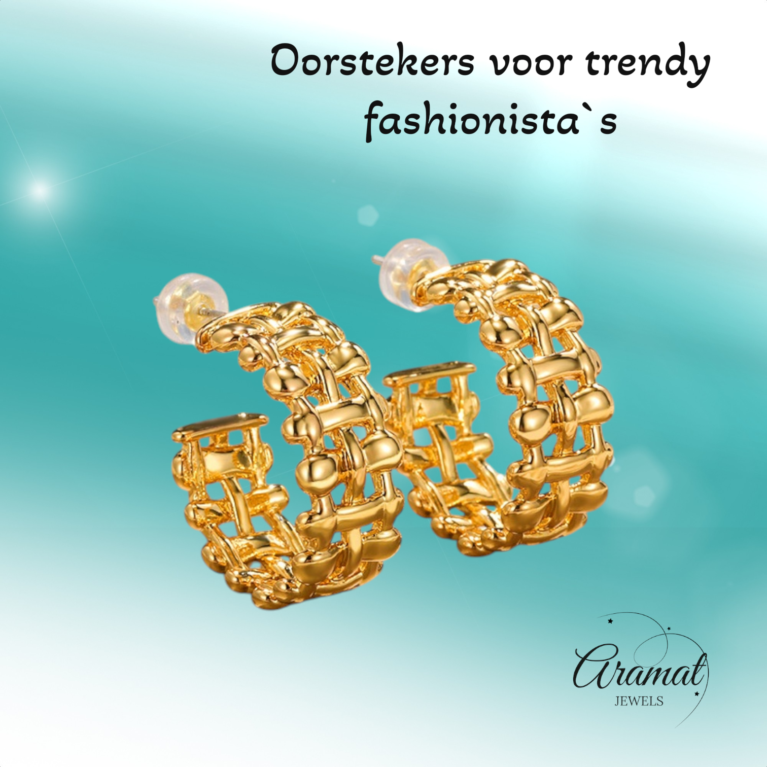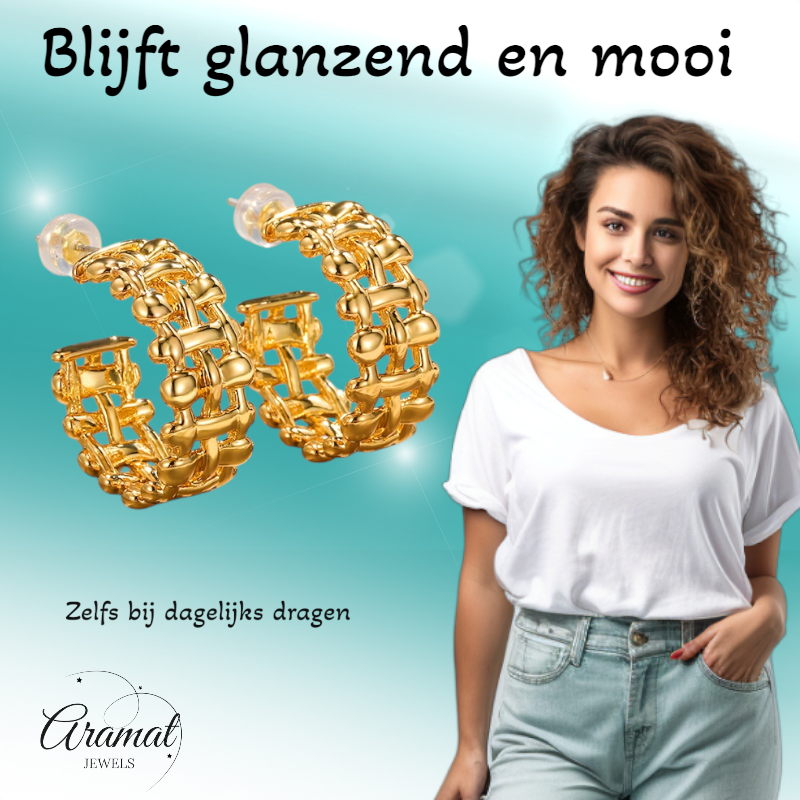 Voeg een vleugje vintage charme toe aan je look met deze prachtige gevlochten halve oorringen van Aramat Jewels. Deze oorstekers vallen op door hun gedetailleerde, geweven structuur die zorgt voor een luxueuze en klassieke uitstraling. Met een afmeting van ca. 25x10mm zijn deze oorbellen het ideale statement piece voor de vrouw die houdt van een unieke, minimalistische stijl met karakter.