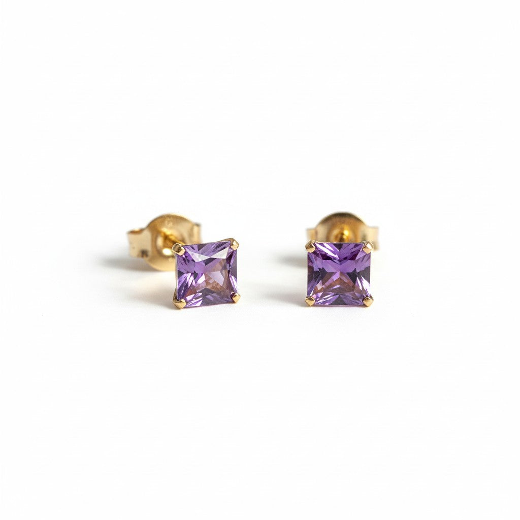 - Bevatten deze oorbellen stenen? Ja, deze oorbellen zijn voorzien van een vierkante paarse zirkonia steen met een diameter van 5mm.