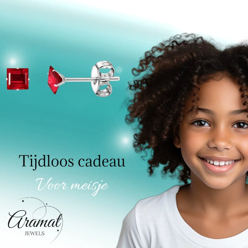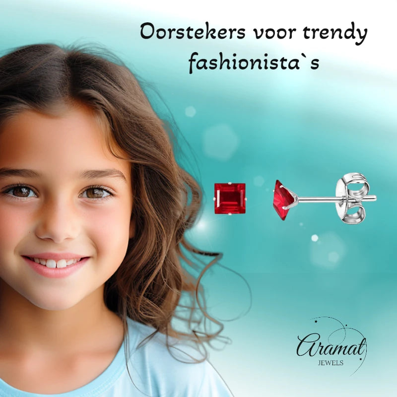 - Bevatten deze oorbellen stenen? Ja, deze oorbellen zijn voorzien van een vierkante rode zirkonia steen met een diameter van 4mm.