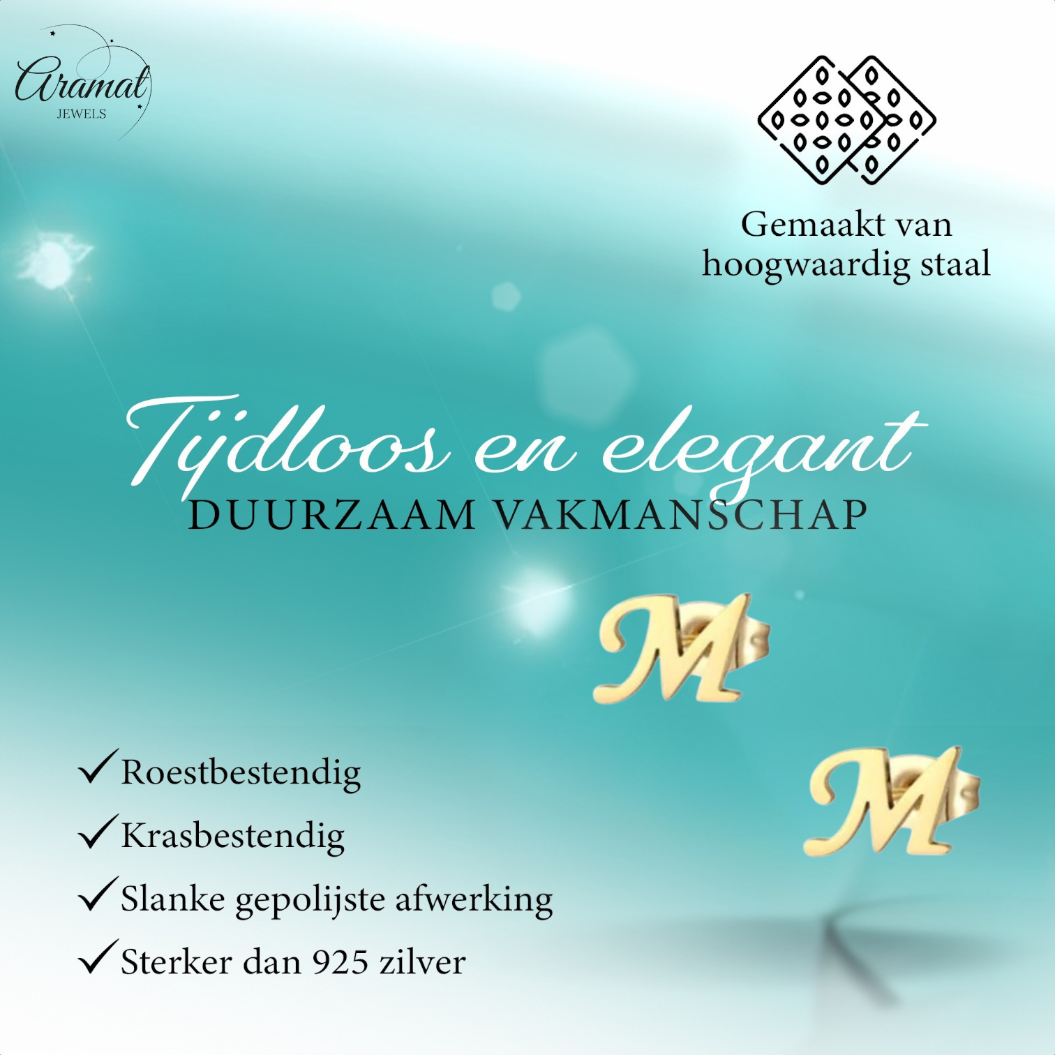 Dit zijn goudkleurige RVS oorstekers met de letter M, geschikt voor ieder oor en nikkelarm.