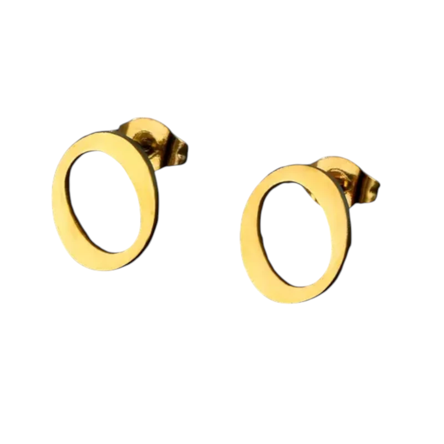 Dit zijn goudkleurige RVS oorstekers met de letter O, nikkelarm en geschikt voor elke leeftijd.