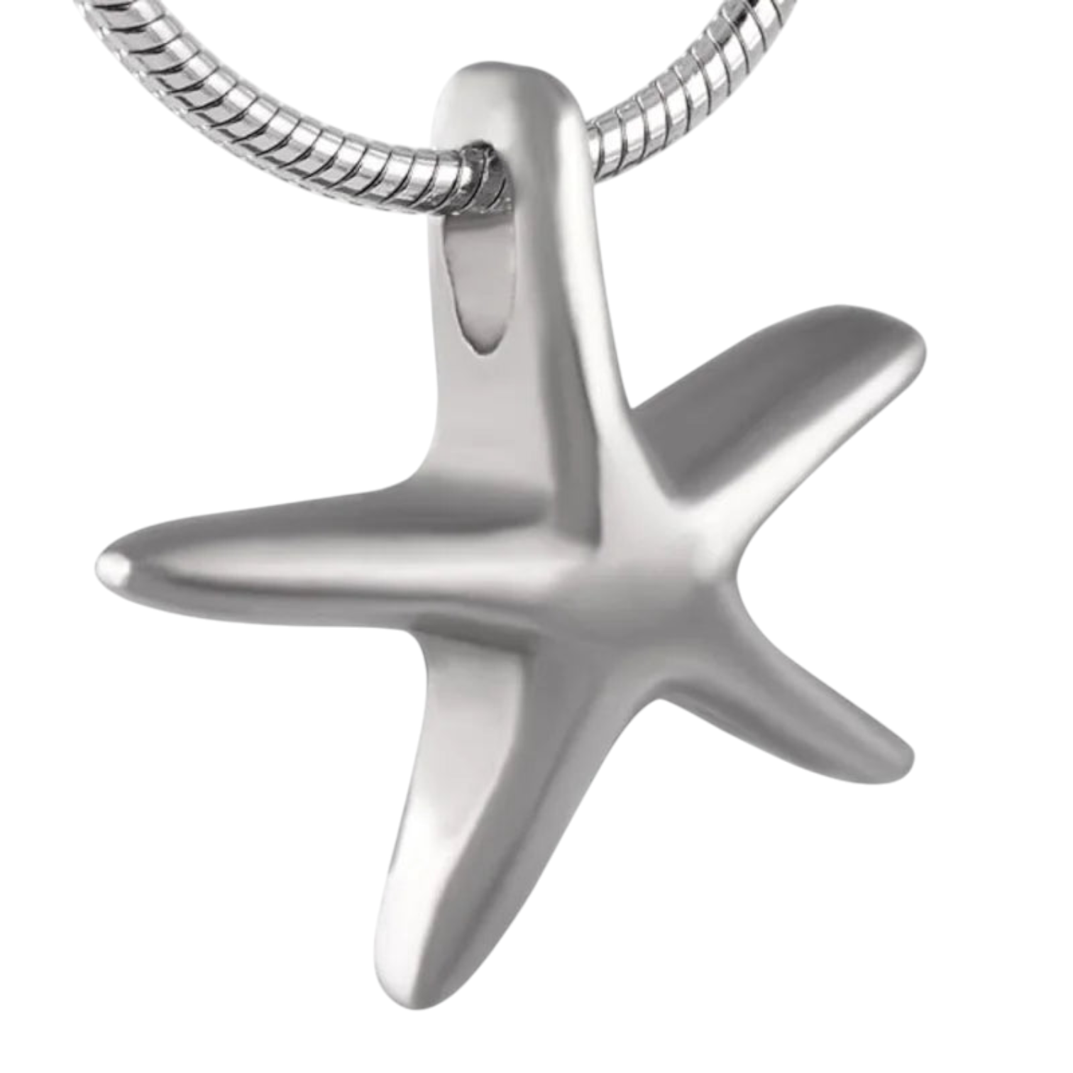 Deze zilverkleurige ashanger in de vorm van een zeester is een bijzonder rouwsieraad waarmee je de herinnering aan een dierbare altijd bij je draagt. De zeester staat voor hoop, eeuwige verbinding en kracht na verlies. Door het compacte formaat en de glanzende afwerking is deze crematiehanger stijlvol en subtiel, perfect voor dagelijks gebruik. Een mooi aandenken dat troost biedt en tegelijk past bij iedere stijl. ⭐