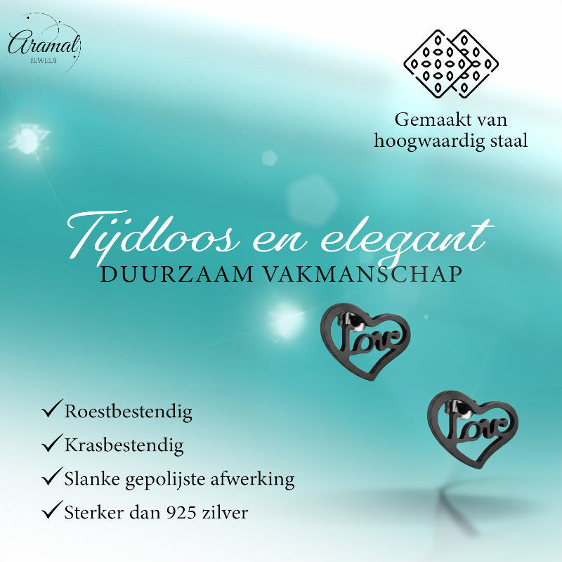 Het tijdloze zwarte design met een open hartje en "love" tekst straalt moderne liefde en elegantie uit 💖. Met een afmeting van 9mm zijn ze opvallend zonder te overheersen, perfect voor dagelijks gebruik en speciale momenten.