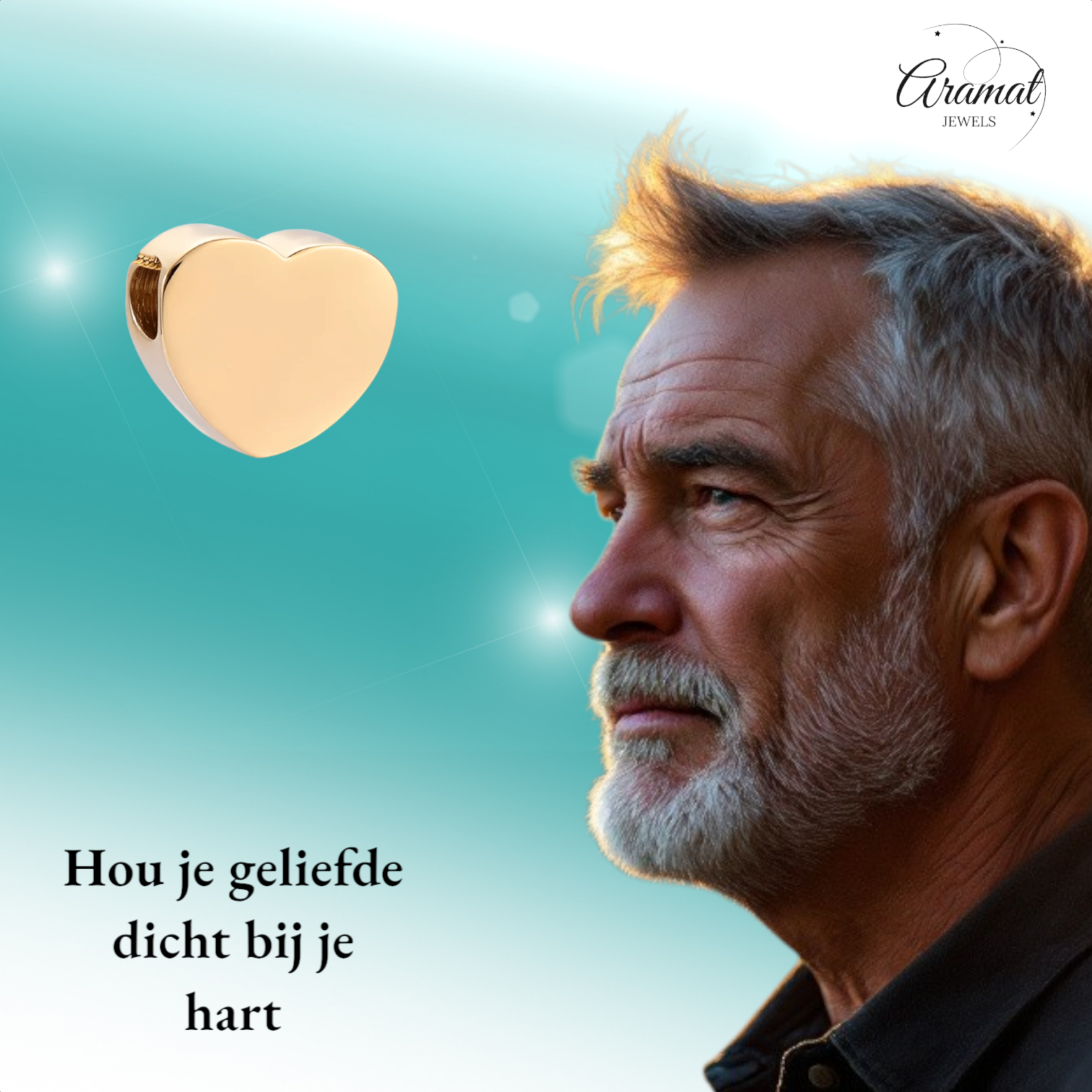 Wil je altijd een tastbare herinnering bij je dragen? Deze goudkleurige hartvormige asbedel van roestvrij staal is speciaal ontworpen om een kleine hoeveelheid as op een veilige, stijlvolle manier te bewaren. Door de glanzende afwerking en warme kleur geeft het sieraad troost én elegantie, zowel zichtbaar als onopvallend onder kleding. ✨