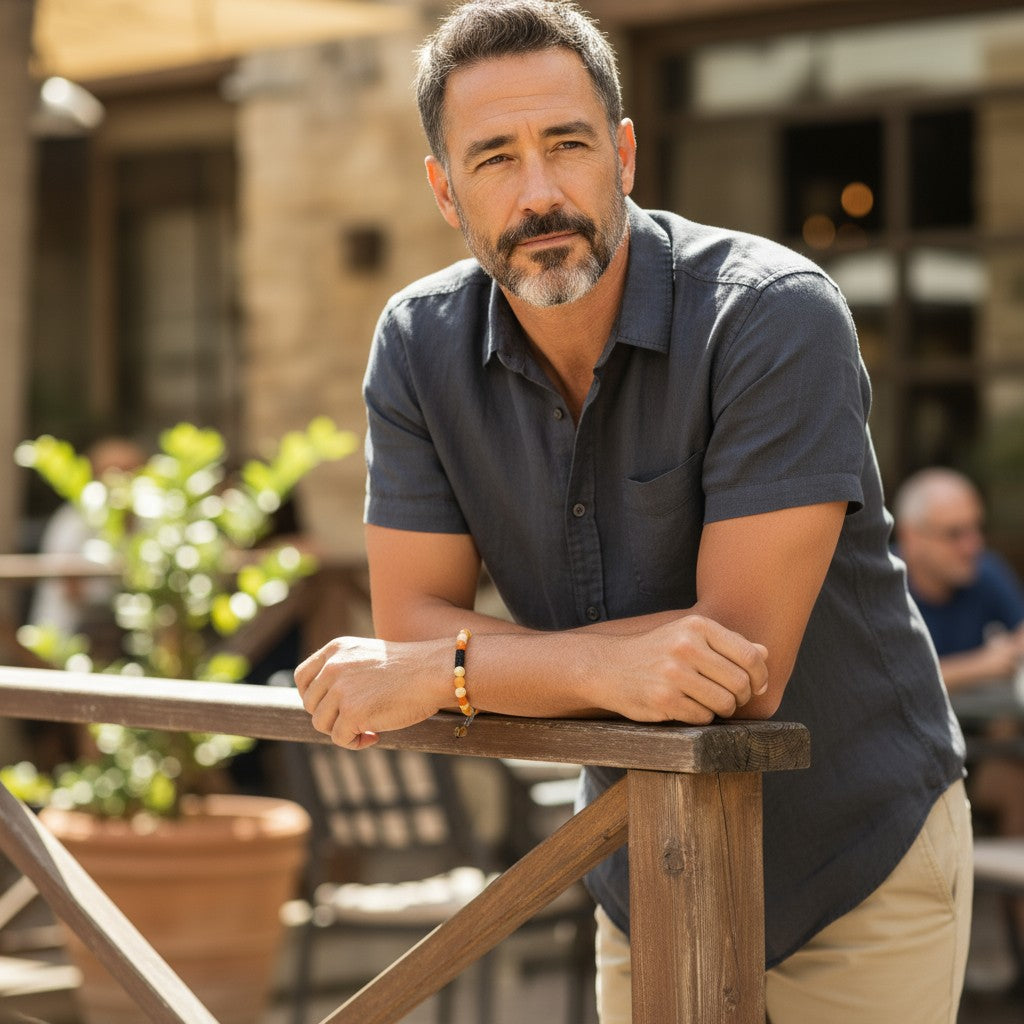 Ontdek de unieke schoonheid van de verstelbare armband van Aramat Jewels®, gemaakt van hoogwaardig oranje gestreept agaat natuursteen. Deze handgemaakte armband is een perfecte combinatie van stijl en natuurlijke elementen, waardoor het een must-have accessoire is voor iedereen die op zoek is naar iets bijzonders.