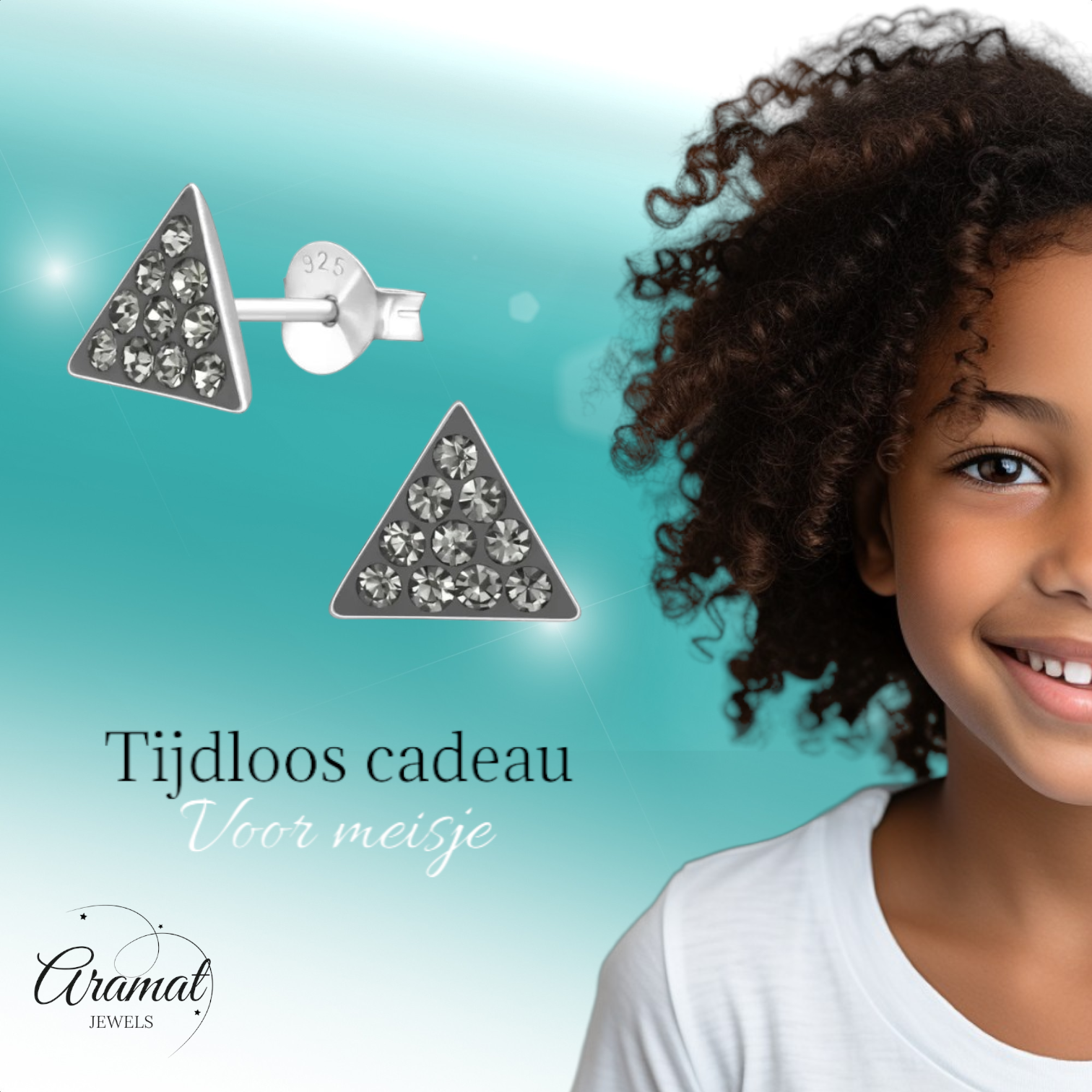 Wil je een subtiel statement maken? Ontdek deze zilveren driehoek oorstekers met grijze Black Diamond kristallen van Aramat Jewels. Of je ze nu als oorknopjes, studs of minimalistische juwelen draagt – ze zorgen voor een verfijnde uitstraling in elk oor.