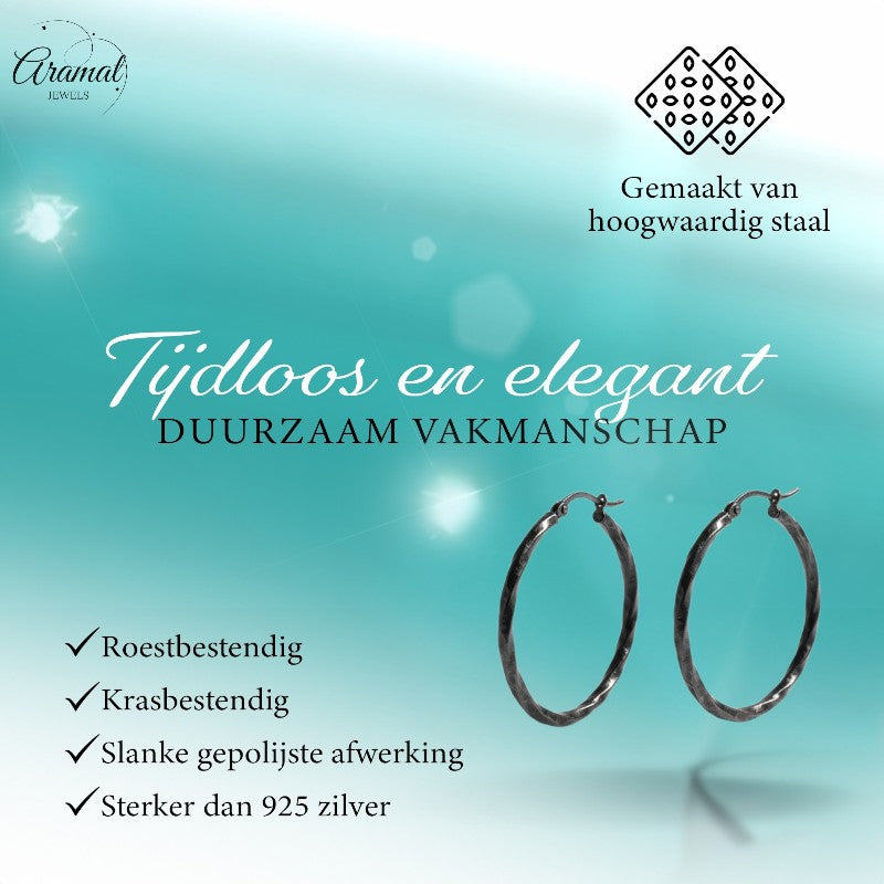 Maak een statement met onze Stalen Zwarte Gedraaide Oorringen van Aramat Jewels®. Deze prachtige oorringen zijn perfect voor dames die op zoek zijn naar een combinatie van stijl en elegantie, met een moderne, trendy uitstraling. ✨